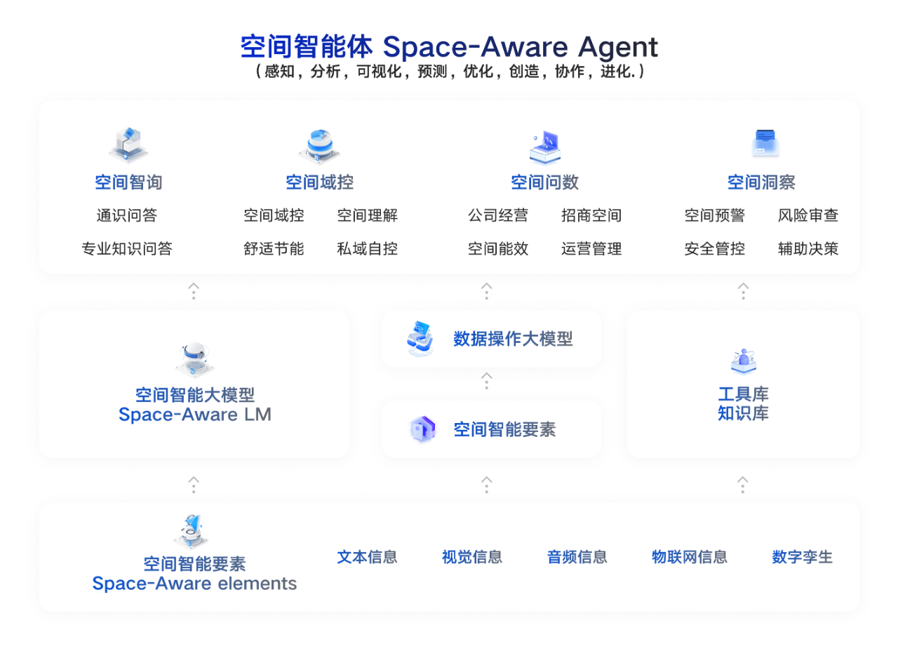 ▶ 空间决策层:以空间大模型(Space-AwarenessLM)为引擎,支持自然语言理解与复杂空间推理,实现精准资源调配。